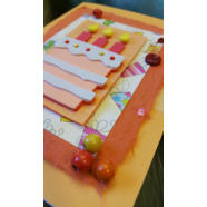 Orange with a foam birthday cake and 3 candles