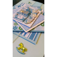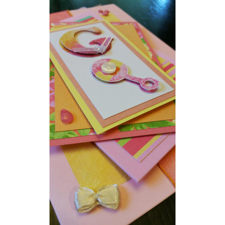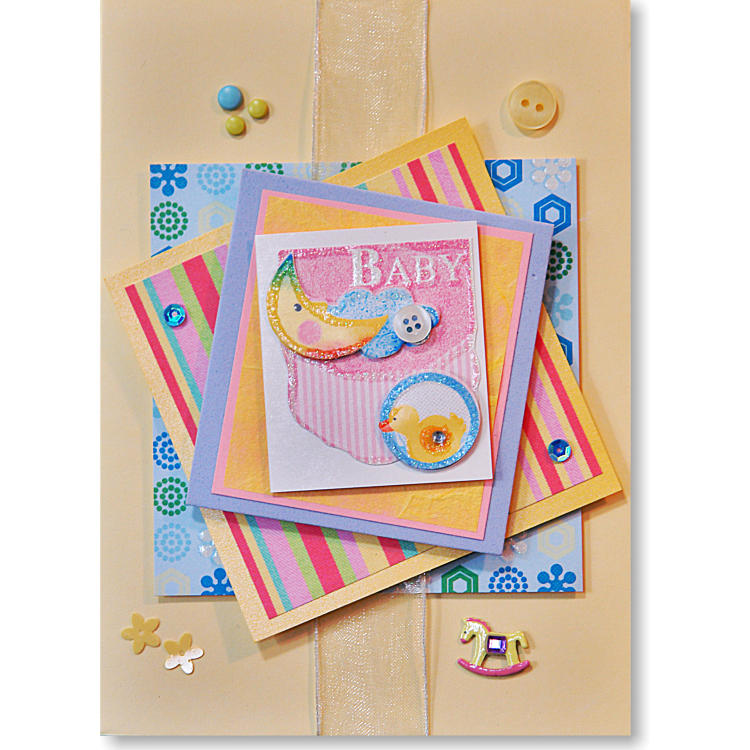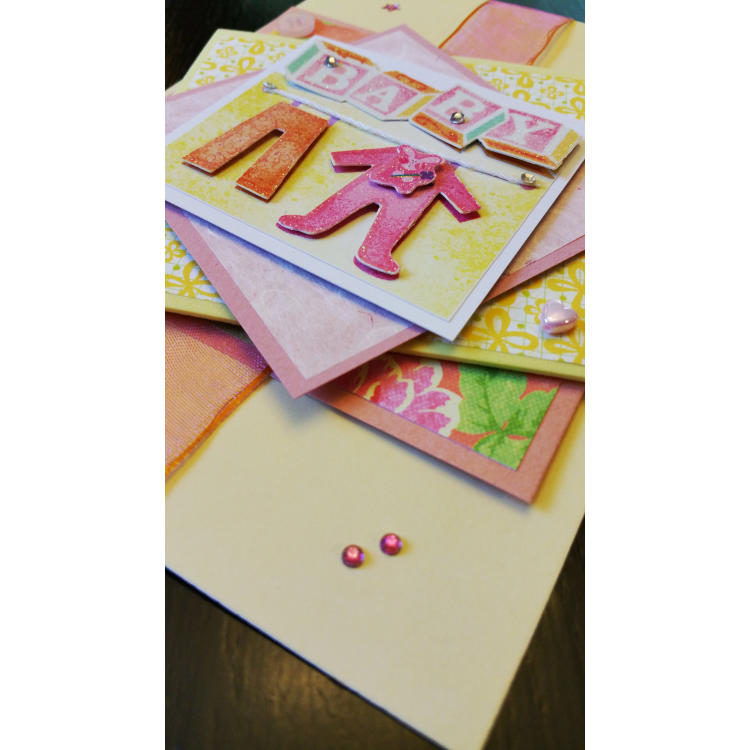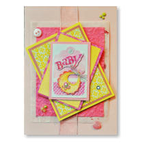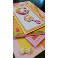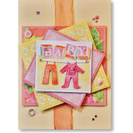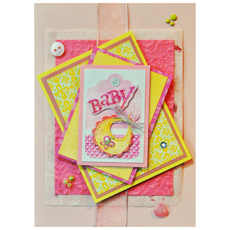 Pale pink and yellow card has a babies bib