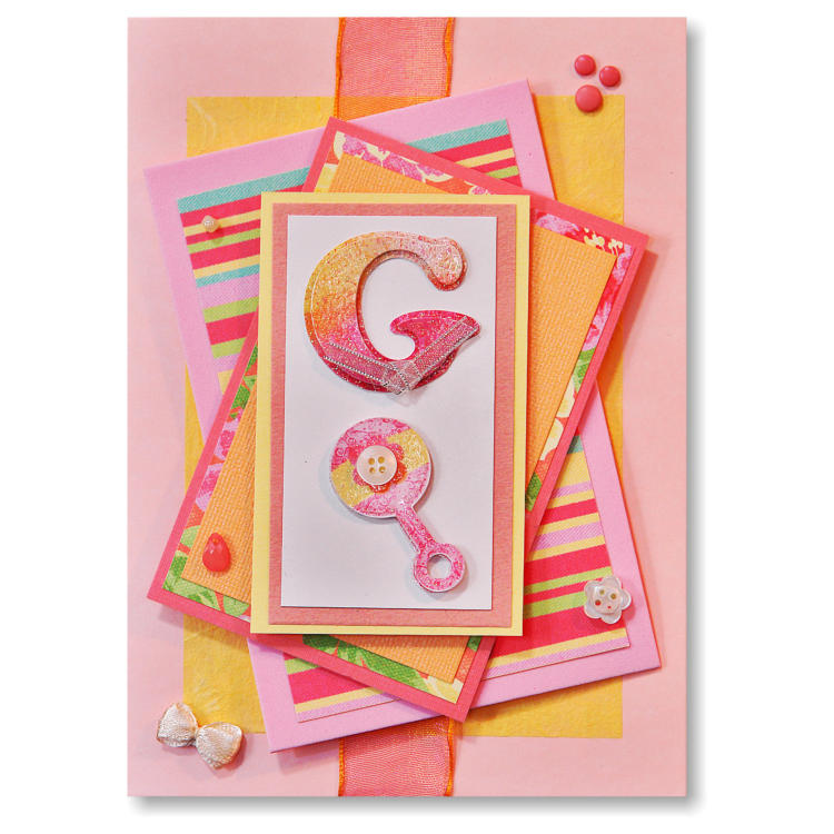 Pale pink and yellow with a baby rattle and