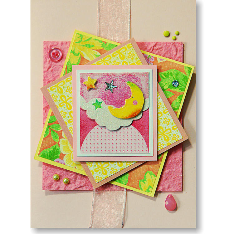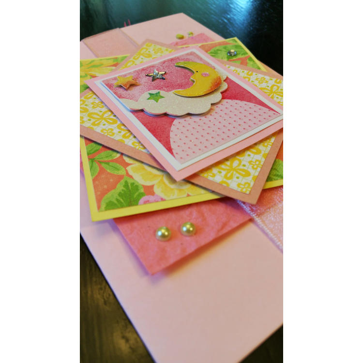 Pale pink and yellow with a moon and stars
