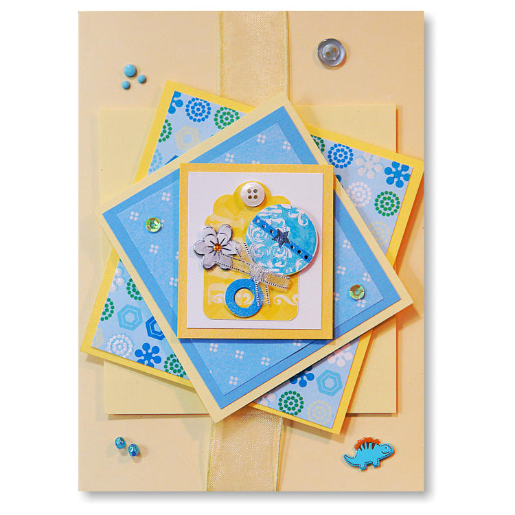 Yellow and blue with a baby rattle