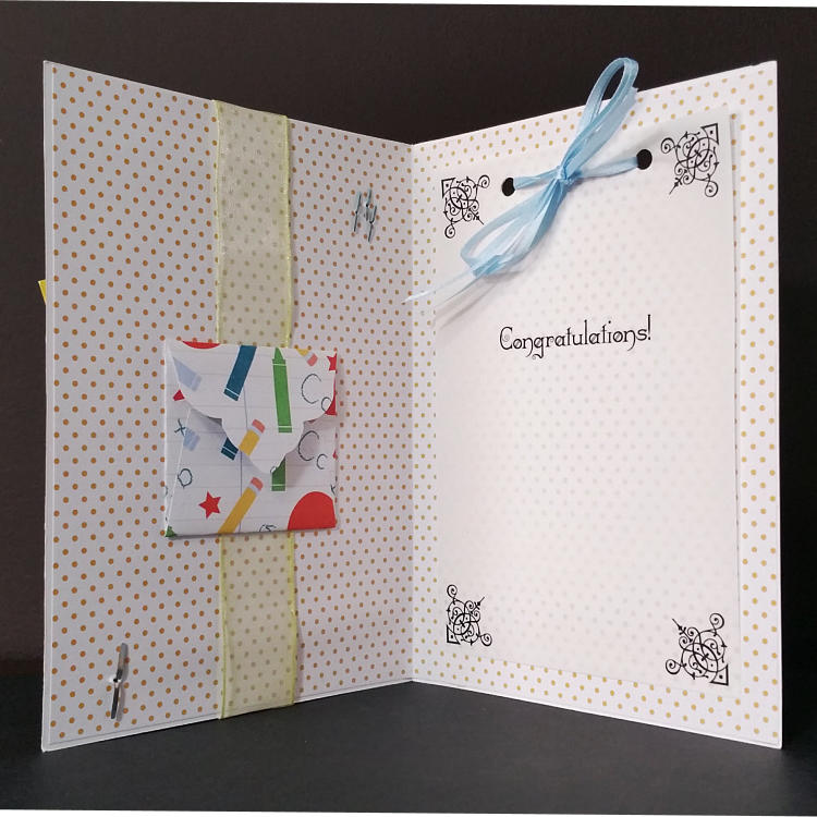 Features layers of card and paper, brads