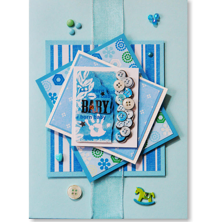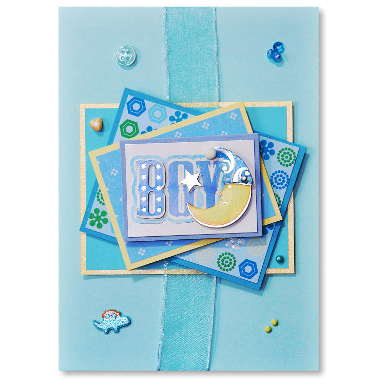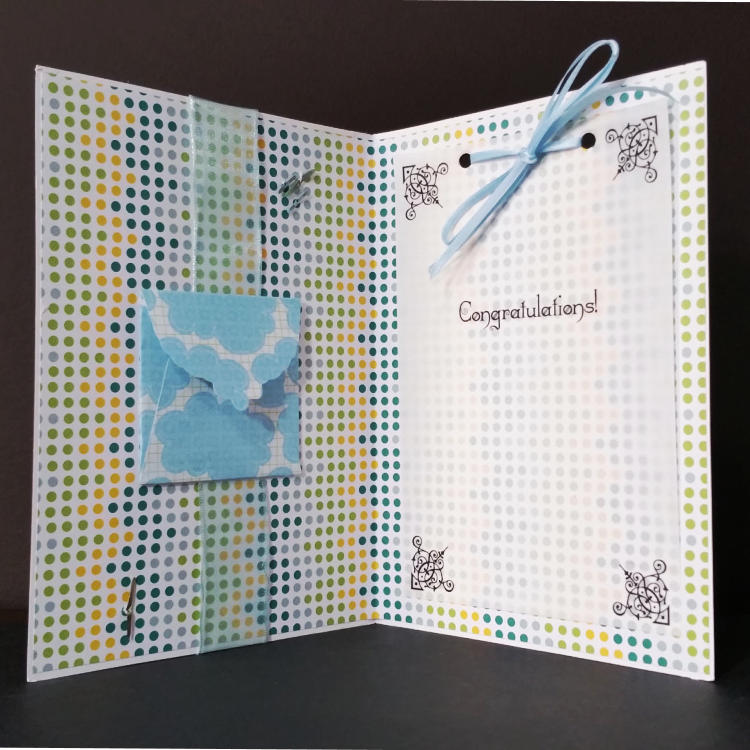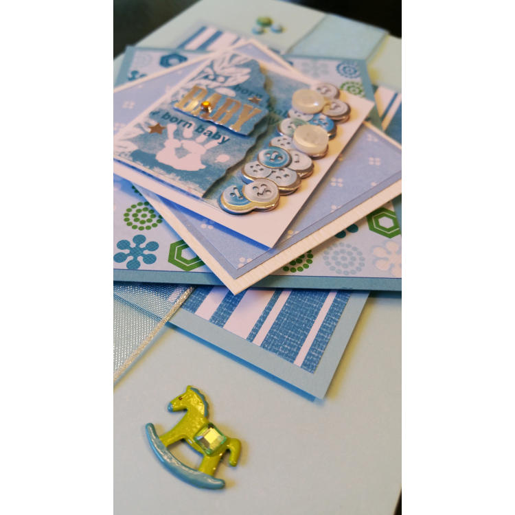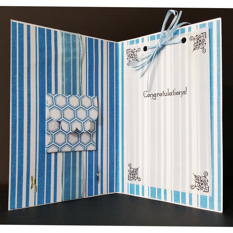 Features layers of card, blue organza ribbon,